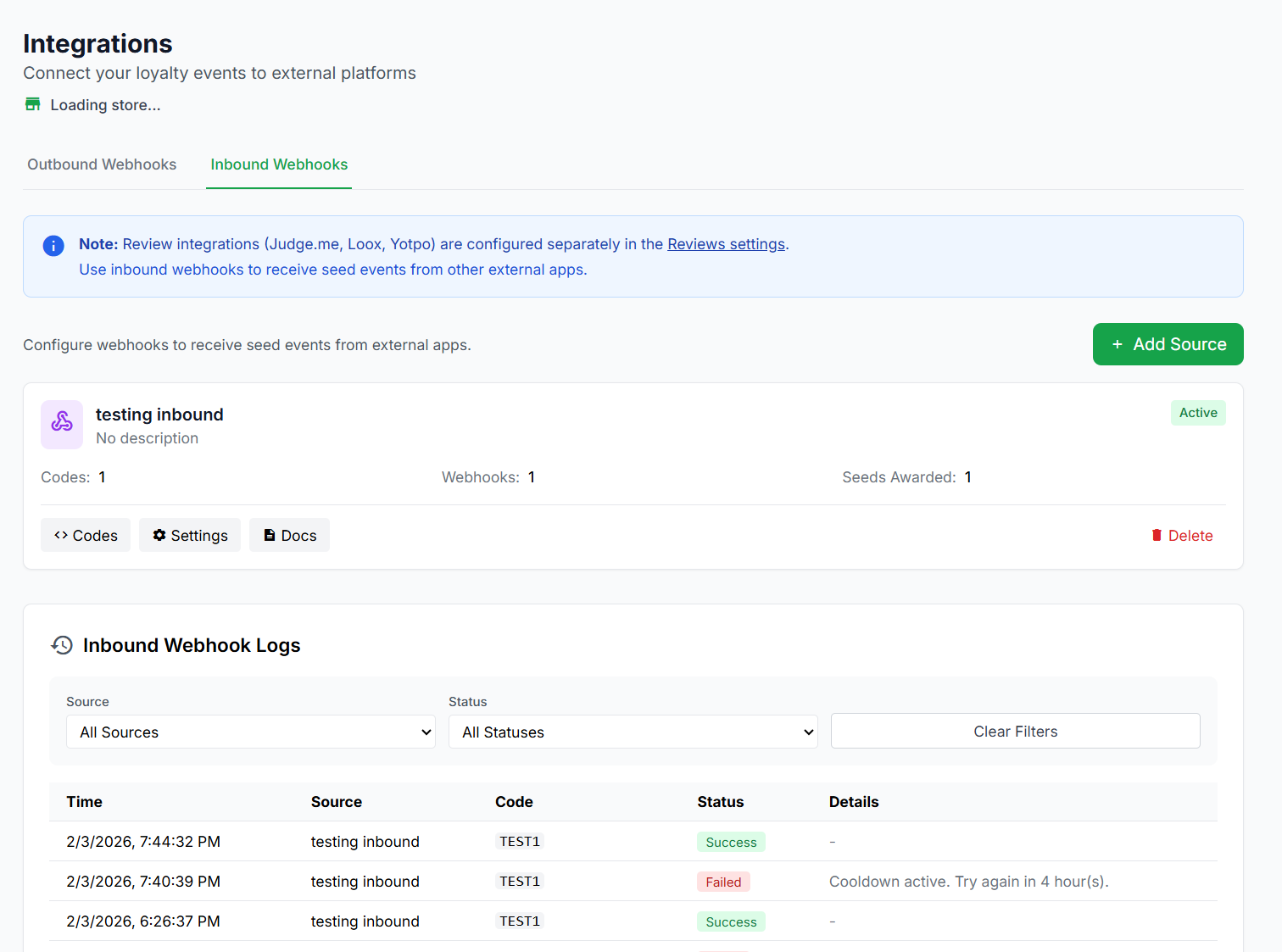 Navigate to Stores → [Your Store] → Integrations → Inbound Webhooks. Click + Add Source and give it a name that describes the external platform (e.g. "Typeform Quizzes" or "Zapier Automation").