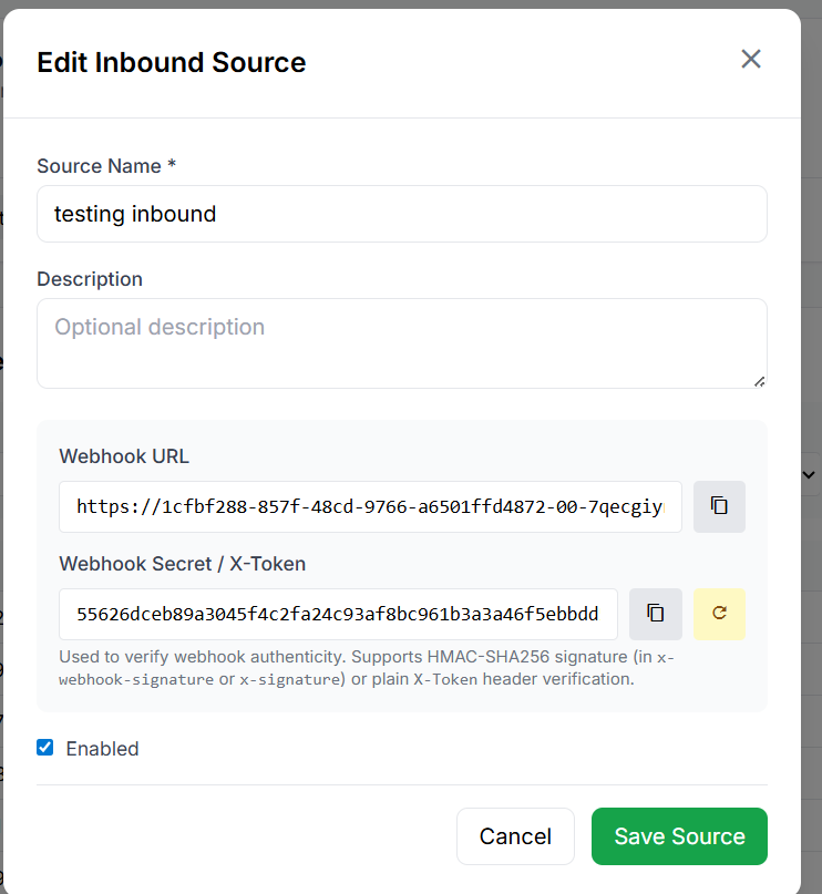 - Each source gets a unique 64-character webhook secret, auto-generated and encrypted at rest
