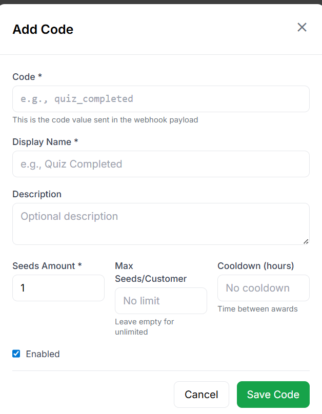 | Max Seeds/Customer | No | The maximum total seeds a single customer can earn from this code. Leave empty for unlimited. Once a customer reaches this limit, further webhook calls for them will return success but award 0 seeds. |