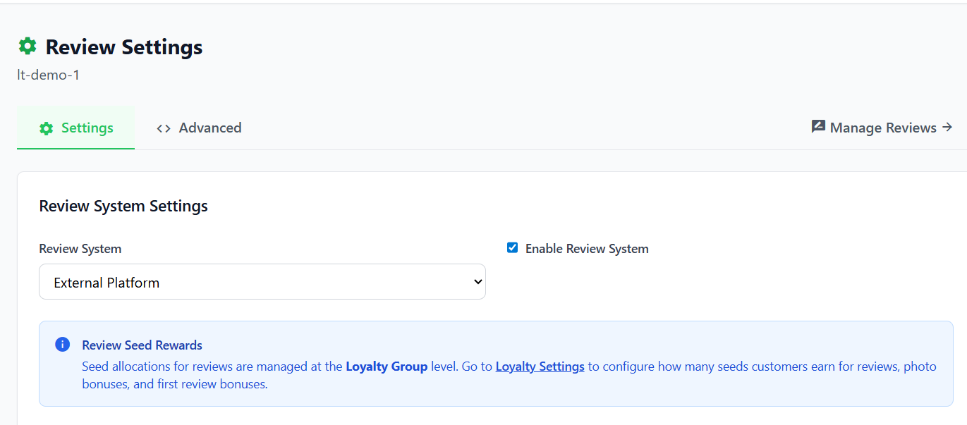 Note: Seed allocations for reviews are managed at the Loyalty Group level. Go to your store's Loyalty Settings → Seed Settings to configure how many seeds customers earn for reviews, photo bonuses, and first review bonuses.